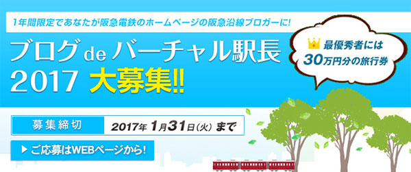 最優秀は30万円分の旅行券!阪急電鉄のお客様ブロガー「バーチャル駅長」(2017年度)を募集!