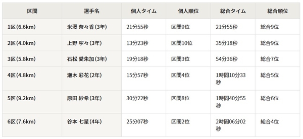 本学女子駅伝部は2区と4区に大学の全国駅伝初出場の選手を起用し、そのほかの区間は前回大会で同じ区間を経験した選手が担当しました。