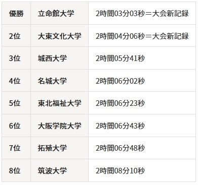この大会は弘進ゴムアスリートパーク仙台(仙台市陸上競技場)をスタート、フィニッシュ地点とする6区間38.0kmで実施され、オープン参加の1チームを含む26チームが出場しました。1位は2時間03分03秒の大会新記録を樹立した立命館大学、2位は大東文化大学で2時間04分06秒と、こちらも従来の大会記録を上回りました。3位は2時間05分41秒の城西大学でした。