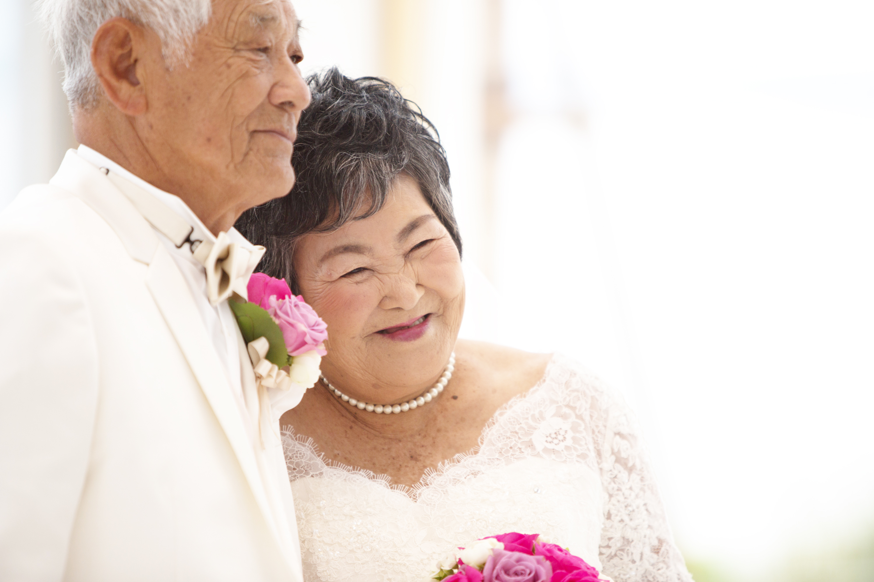 宜野座村出身の幸夫さんとうるま市宮城島出身の幸子さん。出会いは幸夫さんが、釣りの為に宮城島を訪れた際、幸子さんに一目惚れしたことがきっかけでした。2人は1963年に自宅で結婚式を挙げ、現在は、子供5人、孫12人、ひ孫3人、「美らの教会」で2度目の挙式をしたことについて、「宜野座村で長生きしてよかった。(幸子さんが)一段ときれいだな」と。幸子さんは挙式後パーティーで「子供たちにはいいお父さん、孫たちにはよいじーちゃん、私にすればいいボーイフレンドです。いつまでもいいボーイフレンドでいてください」と幸夫さんにお手紙を読んだ。挙式後に幸子さんは「幸せな妻に、幸せな夫という、これから名前に恥じないような夫婦でいきます。」とコメントされました。