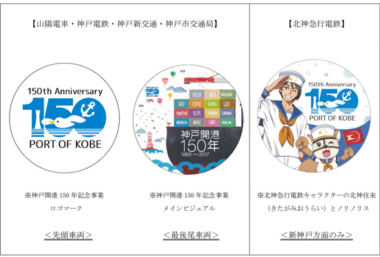 2017年1月10日 18:15山陽電気鉄道株式会社(以下、「山陽電車」)、神戸電鉄株式会社(以下、「神戸電鉄」)、北神急行電鉄株式会社(以下、「北神急行電鉄」)、神戸新交通株式会社(以下、「神戸新交通」)、神戸市交通局では、神戸港が2017年1月1日に開港150年を迎えたことを記念して、ヘッドマーク、ドア横ステッカーなどを掲出した「神戸開港150年」記念車両の運行や、その他ポスター等の掲出を行います。