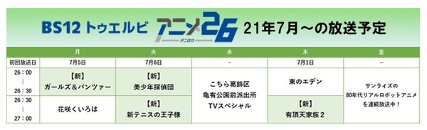 全国無料放送のBS12 トゥエルビ( 本社:東京都渋谷区、代表取締役社長:須磨直樹)では、平日26時台に新旧アニメの名作・話題作をお届けする放送枠『アニメ26(アニロク)』を放送しております。7月からも話題作、注目作をお届けします。