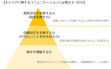 キャリア・コミュニケーションの質を高め、その場の課題を解決するために必要なスキルを「3つの段階」に整理しました。