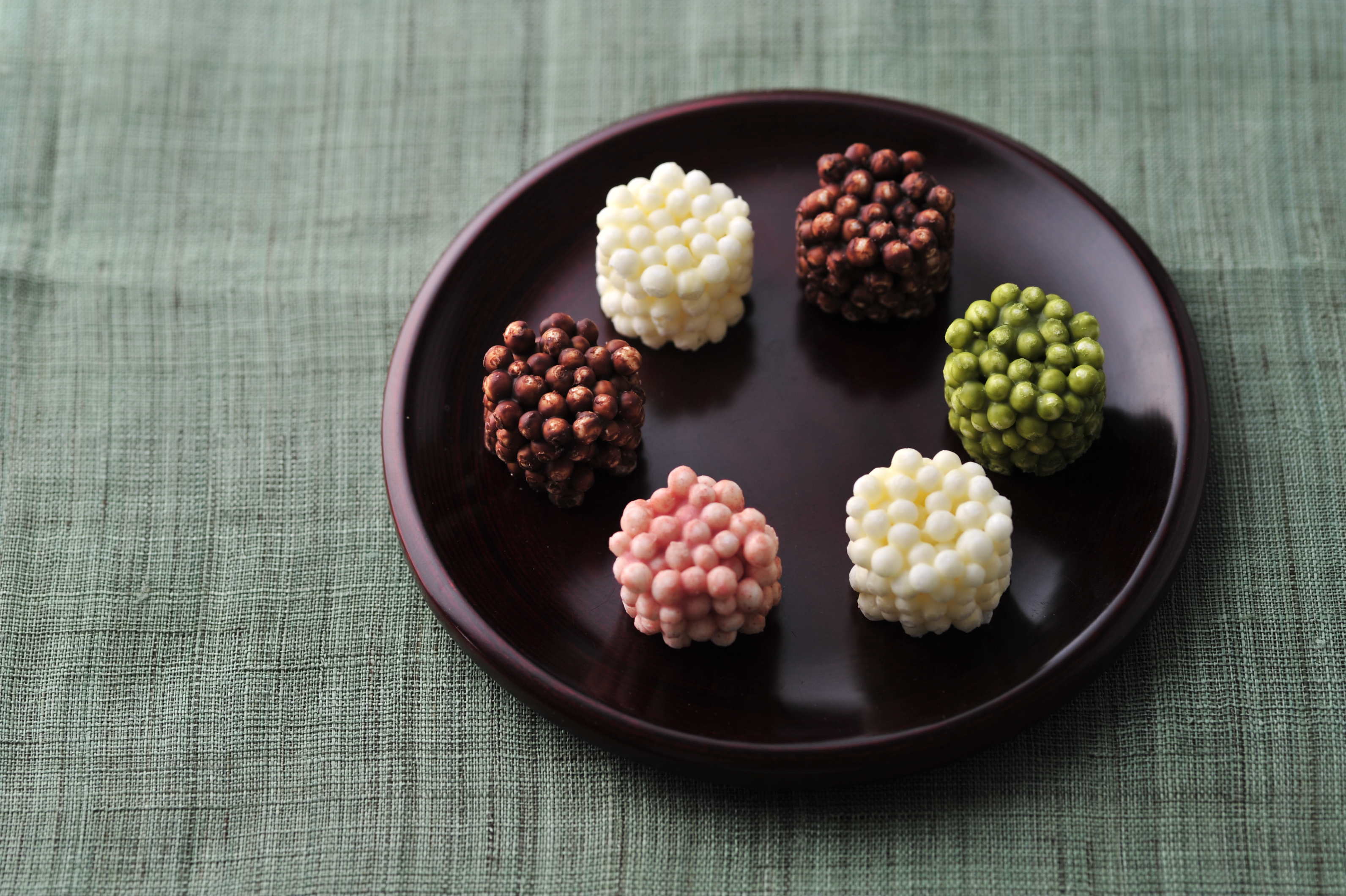 さくさくした食感の「もち米のパフ」をビターチョコ、ホワイトチョコ、抹茶チョコ、いちごチョコの4種のチョコレートでコーティングし、クランチチョコレートに仕上げました。軽い食感と後味にしっかりお餅の味を感じることができるのが特徴です。