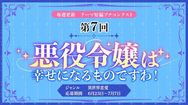 各テーマの募集期間は2週間、全7回を予定しており、今回最終回となる第7回のテーマは〈異世界恋愛ジャンル〉ジャンルから「悪役令嬢は幸せになるものですわ!」です。