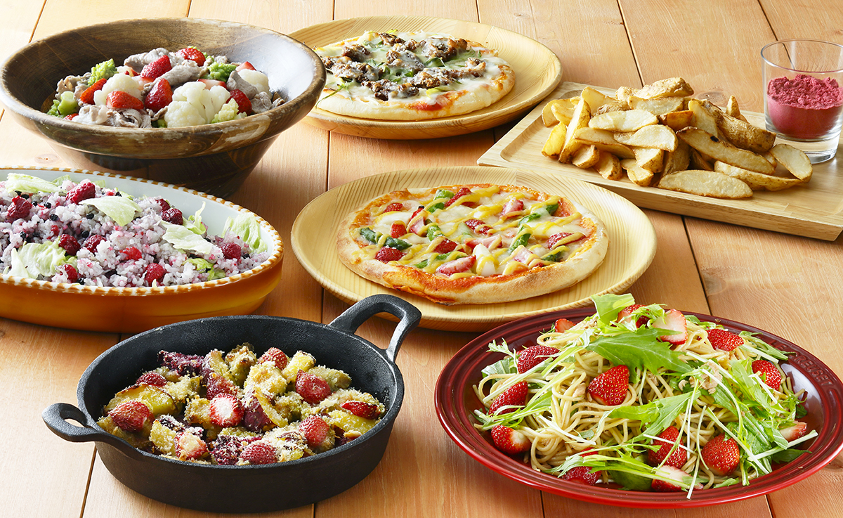 チキンとさつまいものいちごロースト、いちごとシーフードの白味噌ピザ、いちごとツナのバルサミコパスタ、ボイルポークのいちごドレッシング、しらすと春レタスのベリーピラフ、ベリーと豆乳のカレー、自分でつくるジャートスサラダ、自分でつくるオープンサンド など約10種