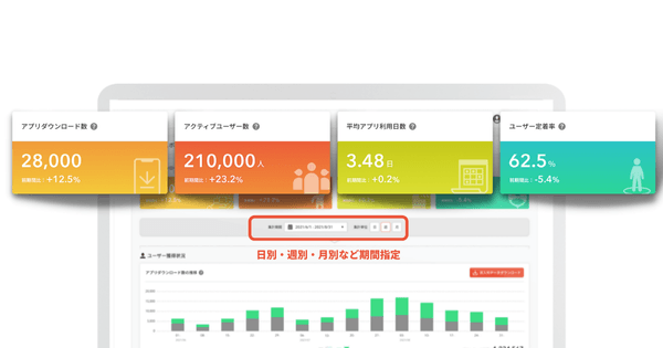 「アプリダウンロード数」「アクティブユーザー数」「ユーザー定着率」などのデータを可視化したパネルを設置。直近30日間の今すぐに知りたい顧客データサマリーをダッシュボードにアクセスするだけで簡単に把握できます。