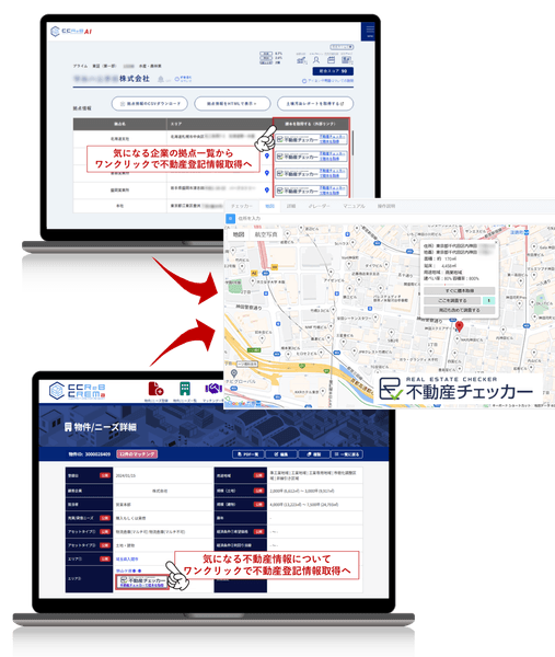今回のククレブシステムと不動産チェッカーの連携により、CRE営業における企業のターゲッティングやニーズのマッチングから不動産登記情報の取得までがシームレスにつながり、DXによる業務効率の改善効果が飛躍的に向上します “CCReB AI”においては、ククレブ独自開発のAIシステムがスコアリングした不動産売買予測スコアの高い企業に関する拠点情報から即時に不動産登記情報を取得すること(別途費用)が可能となり、不動産の権利関係の変遷や面積等の基礎情報を踏まえることでターゲッティング精度のさらなる向上が期待されます。“CCReB CREMa”においても、マッチングシステムに登録した物件の住居表示からワンステップで不動産登記情報が取得できるようになり、効率的な業務推進が可能となります。また、不動産チェッカーで取得した登記情報は同システム内に保存され、企業内で共有できる為、過去に取得した登記情報の重複取得の回避により経費削減に繋がるとともに、登記情報の変動通知機能を活用することでターゲット企業の保有資産のモニタリングも可能となります。
