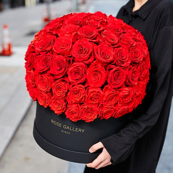 108本のバラの美しさが輝く、クラシカルでオーセンティックなラウンドアレンジ。