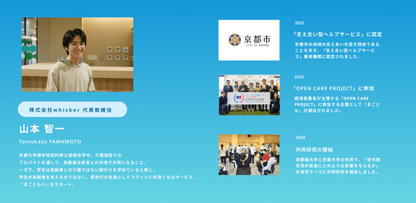 当社の主な事業である『まごとも』は、学生がシニアのもとを訪問し、お出かけやスマホの支援をしたり、話し相手になったりするサービスです。