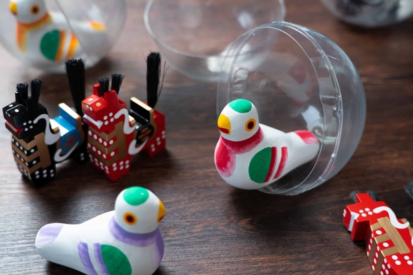 福ガチャのレバーを回すと、専用のカプセルに入った青森ならではの縁起物が出てきます。福を呼ぶ馬として結婚や新築のお祝いにも用いられる南部地方の郷土玩具「八幡馬(やわたうま)」や、幸せを呼ぶ津軽の郷土玩具と言われる「鳩笛」など、何が出てくるかは回してからのお楽しみです。自宅に持ち帰ってそのまま飾ることができます。