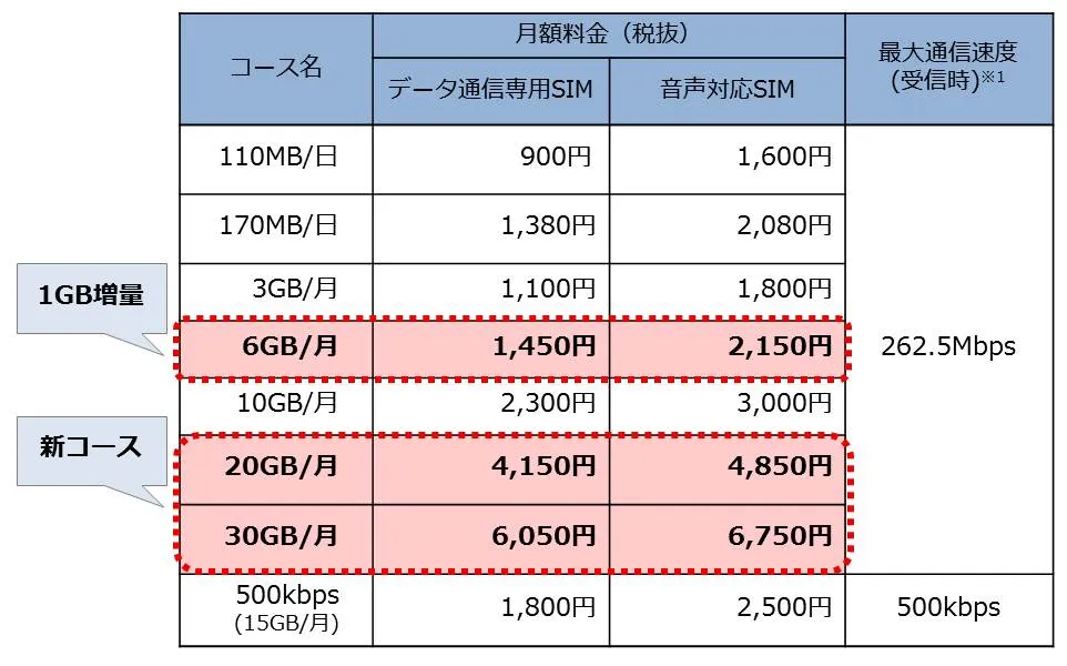(1) 大容量20GB/月コースと30GB/月コースを追加
