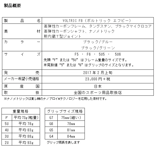 ヨネックス株式会社(代表取締役社長:林田 草樹)は2017年2月上旬にバドミントンラケット「VOLTRIC FB(ボルトリック エフビー)」を世界同時発売いたします。VOLTRIC FBは一般的なバドミントンラケットよりもとても軽量(平均73g)※でありながら、独自の設計と当社バドミントンラケットに初めて採用した素材で、パワーと打ち応えを求めるお客様にもご満足いただける性能を併せ持っています。 “FB”とは軽量化によるスウィングスピードの向上と自在な操作性、ならびにボルトリックシリーズのパワーを象徴する「Flash Boost」の略称です。