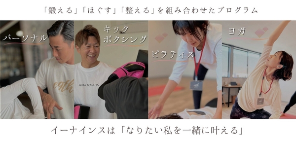 イーナインスではお客様の目標やお悩みをしっかりとヒアリングしながら、パーソナルトレーニング、ピラティス、ヨガ、キックボクシング、全身整体などお客様のライフスタイルやご要望にあわせて最適なトレーニングをご提案しています。私たちはお客様と二人三脚で目標に向かって歩むパートナーです。