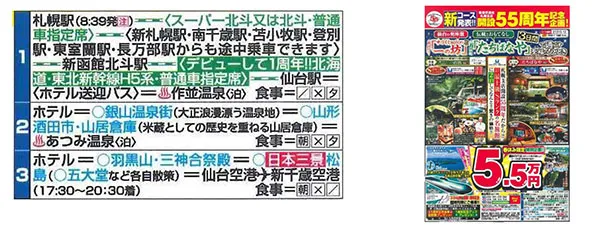 札幌発の商品では、往路に北海道新幹線を利用し、東北の名湯、作並温泉とあつみ温泉に滞在し、優雅な宿で心地よいおもてなしをお楽しみいただきます。