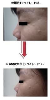 図1は被験者の1人が対象製品を使用する前と5週間使用した後の写真。皮膚科専門医の管理下でTrained Expert により日本香粧品学会が定める「シワグレード標準写真」(図2参照)を参考に目尻の写真撮影をし、スコア付けを行った。その結果、図1の被験者は対象製品の使用によりシワグレード3からシワグレード1となり、目尻シワの減少が認められた。
