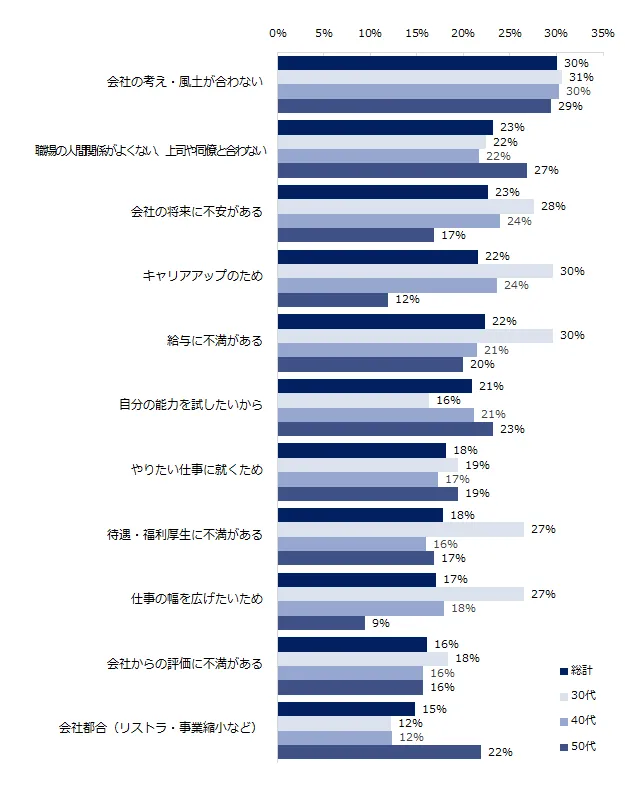 年代別に見ると、30代は他の年代に比べ「キャリアアップのため」(30%)、「給与に不満」(30%)、「待遇・福利厚生に不満がある」(27%)、「仕事の幅を広げたい」(27%)などが上位に挙げられました。能力を磨いてさらに成長したい方や、働く上での衛生的な条件面を充実させたい方が多いようです。50代では「会社都合(リストラ、事業縮小など)」(22%、30代:12%、40代:12%)を理由に、会社の経営状況や外部環境を理由に転職を余儀なくされるケースもあるそうです。