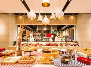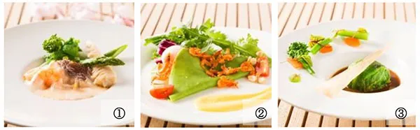 テーブルオーダーの選べるメイン料理は、店内中央270°のパノラマオープンキッチンからいつでも出来立てをサーブ。人気のローストビーフや魚料理に加え、今春は初めて「野菜のメイン料理として桜海老を使った新緑のクレープ(昼のみ)やキャベツのオーブン焼き(夜のみ)が登場します。