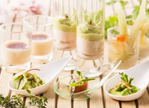 春はキャベツやルッコラなどのみどり野菜を中心としたサラダバーのほか、桜の香りの野菜の蒸気蒸し、湯葉とふきを使った冷製カクテルなど、バラエティに富んだ料理をご用意。