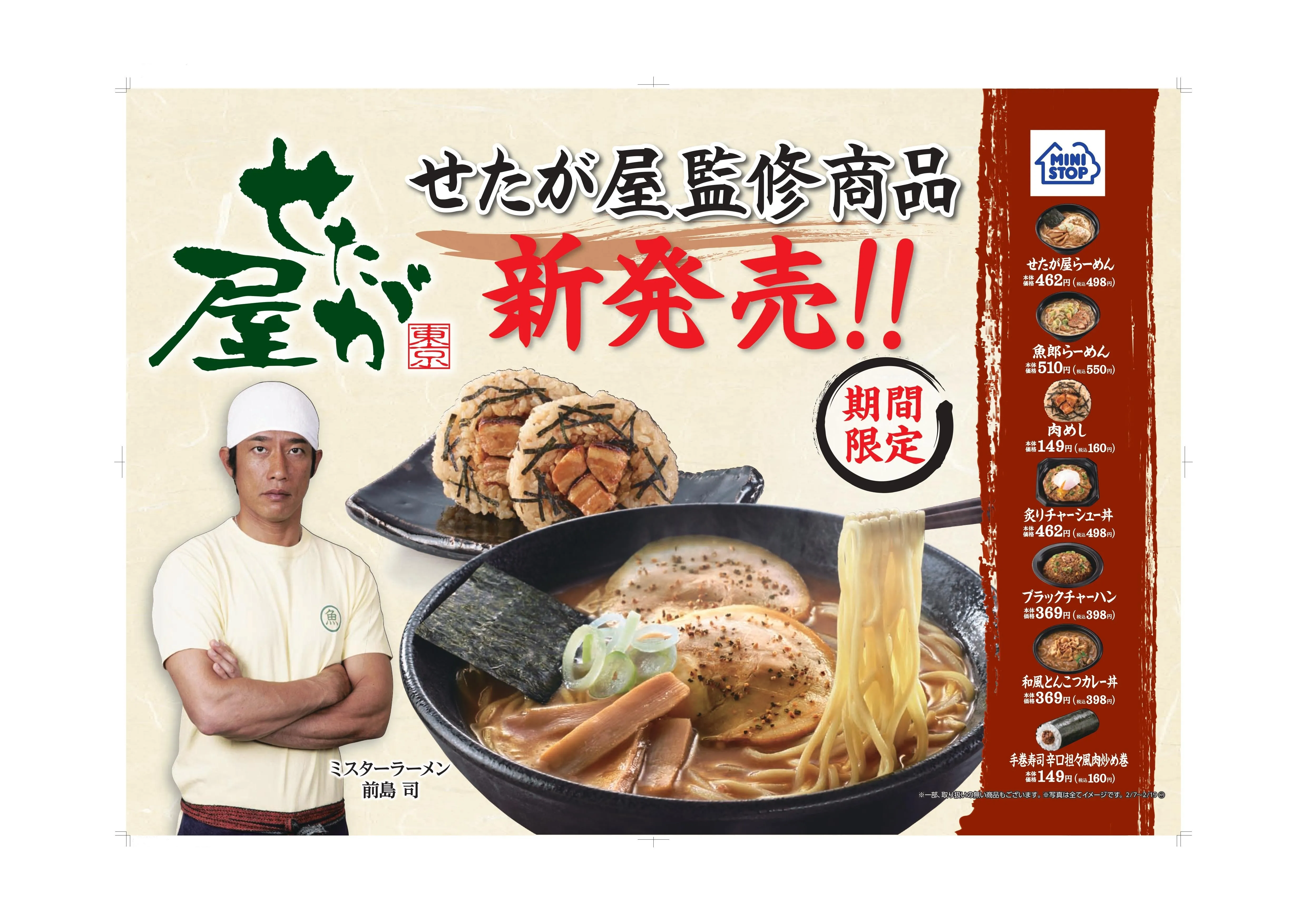 ミニストップ株式会社(本社:千葉県千葉市 代表取締役社長:宮下 直行、以下:ミニストップ)は、人気ラーメン店「せたが屋」監修による商品を、2017年2月7日(火)より国内のミニストップ(2016年12月末現在:2,234店)にて発売します。