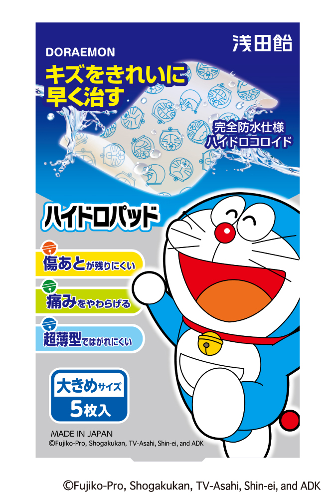 2017年3月1日 10:30株式会社浅田飴(所在地:東京都千代田区、代表取締役社長:堀内 邦彦)は、痛みをやわらげ、キズをきれいに早く治すハイドロコロイド絆創膏『ハイドロパッド』(管理医療機器)を、パッケージに起用したドラえもんの映画最新作「映画ドラえもん のび太の南極カチコチ大冒険」の公開に合わせ、2017年3月3日(金)に全国で発売いたします。