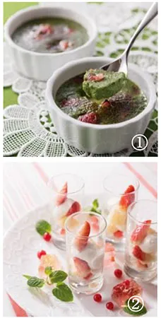 お客様の目の前で炙って提供する「苺とタピオカの抹茶ブリュレ(写真1)」のほか、「苺のグラスショートケーキ(写真2)」「苺ムースのロリポップ」「苺タルト」「ストロベリーチョコレートフォンデュ」などをご用意いたします。