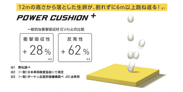 弊社独自の衝撃吸収性と反発性を併せ持つ衝撃吸収素材パワークッション。パワークッションに反発性の高い特殊樹脂を添加し、格子状に+型の溝を最適な間隔と深さで配置した新構造を採用した「パワークッション®プラス」は、従来の軽量性を保ちつつ、衝撃吸収性を28%※2、反発性を62%※3向上させ(一般的な衝撃吸収材[EVA]との比較)、12mの高さから落とした生卵が、割れずに6m以上跳ね返る新衝撃吸収反発素材です。