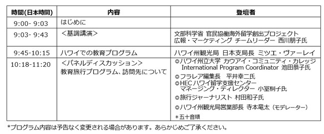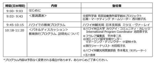 パネルディスカッションは、ハワイ州立大学カウアイ・コミュニティ・カレッジ、HECハワイ留学支援センター、旅行ジャーナリスト、フラ専門誌「フラレア」からパネリストをお迎えし、旅育や親子留学、ハワイ留学状況、ハワイでの短期教育プログラム、ハワイの神話を題材にした楽曲とその場所についてお話いただきます。パネルディスカッションを通して、ハワイにおける教育旅行プログラムの新しい形について探求します。
