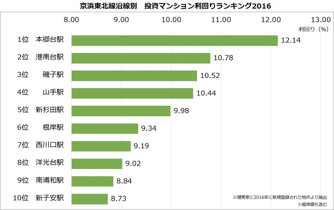 不動産投資と収益物件の情報サイト「健美家(けんびや)」を運営する健美家株式会社(本社:東京都港区、代表取締役社長:倉内敬一)では、同サイトに登録された新規物件を集計し、「京浜東北線沿線駅別マンション投資利回りの平均」の調査結果をまとめましたのでお知らせいたします。