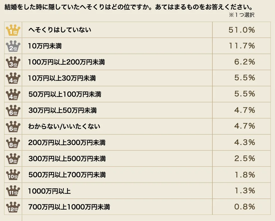 ところで、200万円以上の「へそくり」があると答えた方の合計は、10.7%となりました。約1割の方が結婚を前にして200万円以上の「へそくり」を蓄えていたのですね。それにしても、1.3%の少数派とはいえ1000万円以上の「へそくり」があったと答えていた方がいたことは驚きです。「へそくり」というより、これは立派な「資産」と呼べる金額ですね。