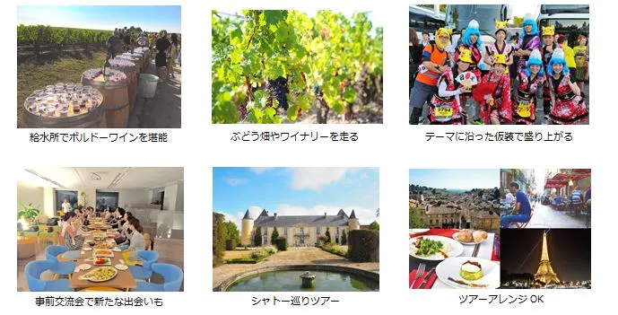 内容:往復航空券、ホテル、メドックマラソン参加、シャトー巡り、ボルドー市内観光、パリ滞在