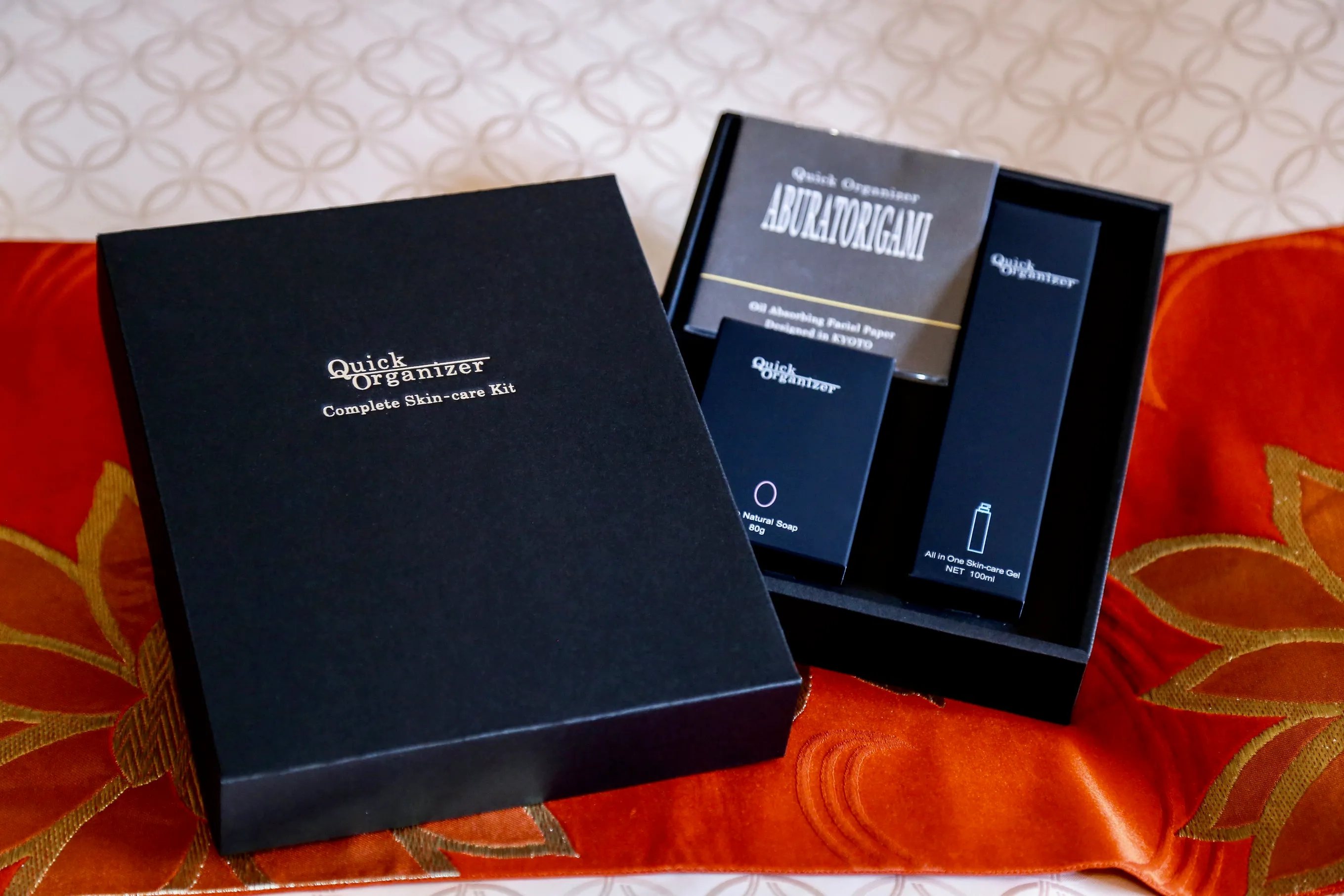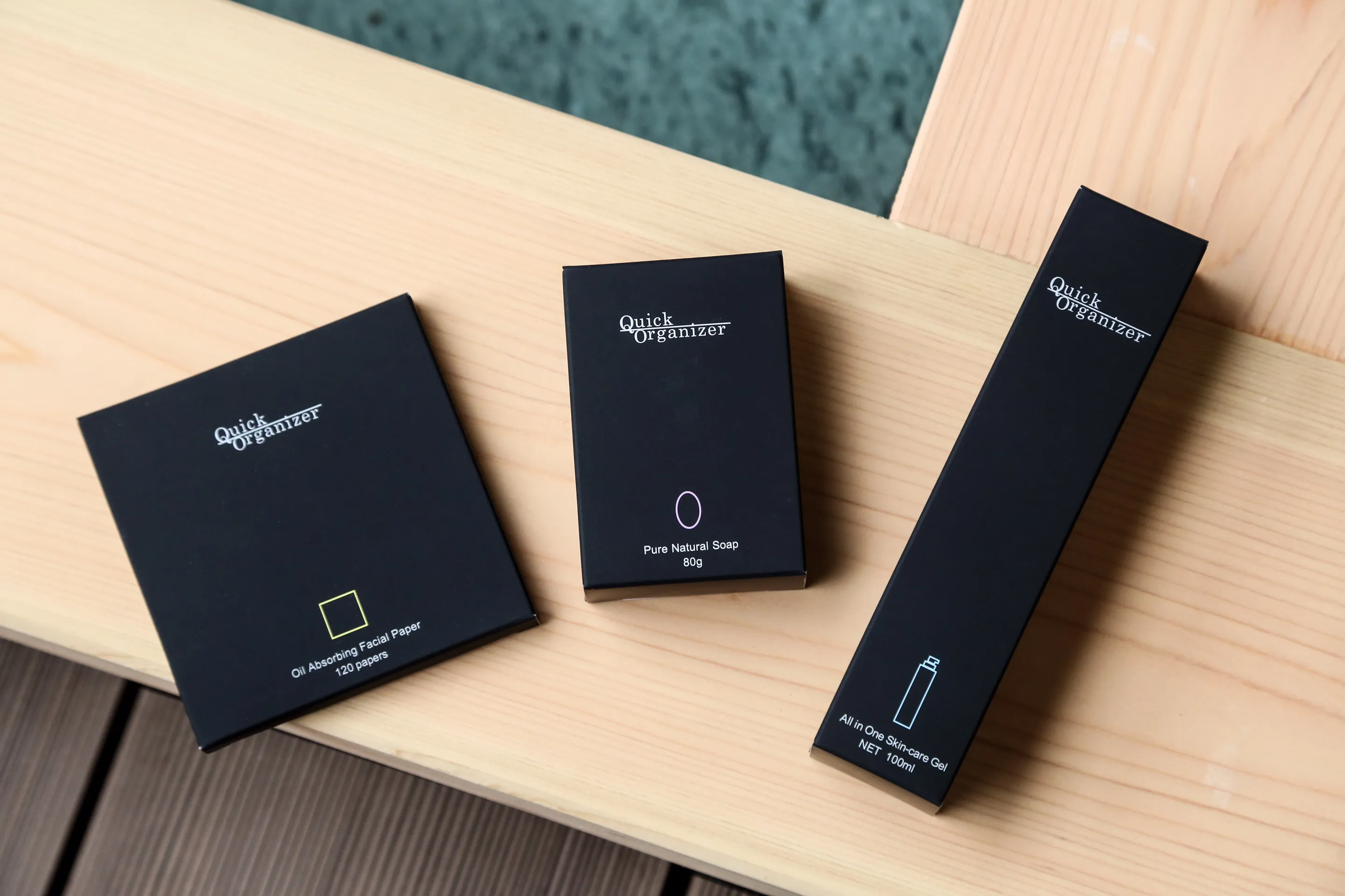 肌の保護・油分調整・紫外線ダメージ防御を一本で完了できる【1】シンプルスキンケアQuickOrganizer【2】油とり紙【3】炭石鹸の3点をセットにして化粧箱にてご提供