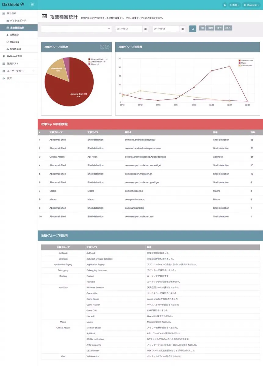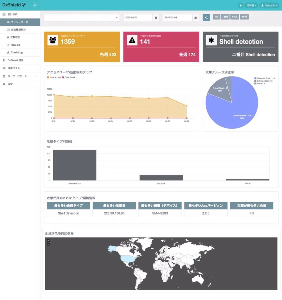 DxShieldは暗号化やハッキングツールの遮断、アプリケーションの偽造・改ざん検知・バーチャルマシン対策、メモリに対する攻撃防御など多くのセキュリティ機能を備えております。また、Webコンソールから、アプリケーションの再配布なしにリアルタイムな攻撃の確認や、セキュリティポリシーの変更、統計情報の確認が行えるようになっております。これにより、企業は中期的な情報セキュリティ対策の計画や、費用対効果の明確化が行えるようになり、より安心してモバイルアプリケーションを展開することが可能になっております。また、事前調査を通して既に複数社で試験導入が決まっており、今後さらに拡大する見通しです。