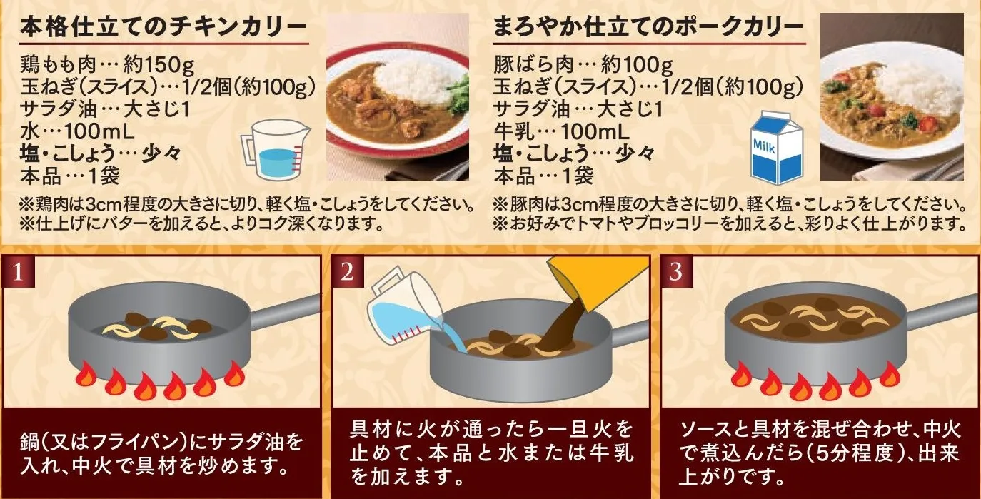 鶏肉、豚肉、野菜など・・・どんな具材にも合うカリーソースです。また、お好みで水の代わりに牛乳を加えるとマイルドになり、カレー粉を加えると、よりスパイシーになります。