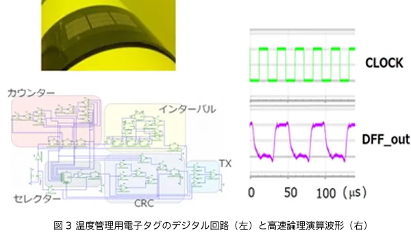 大阪府立産業技術総合研究所のグループは、物流温度モニター用として、冷蔵・冷凍温度範囲であっても安定に動作可能なフレキシブル温度センサ構造を開発しました。またパイクリスタル株式会社と共同で、世界最高の応答速度をもつ有機CMOSフリップフロップ回路を用いて、温度センサのアナログ信号をデジタル信号に変換する多ビットA/Dコンバーターを、世界で初めて印刷でできる半導体を用いて実現しました(図4)。(1)の有機半導体CMOS回路と組み合わせることによって、非接触通信可能な温度管理用電子タグが構成でき、物流管理、環境管理などの低コスト温度モニターへの利用が実現できます。