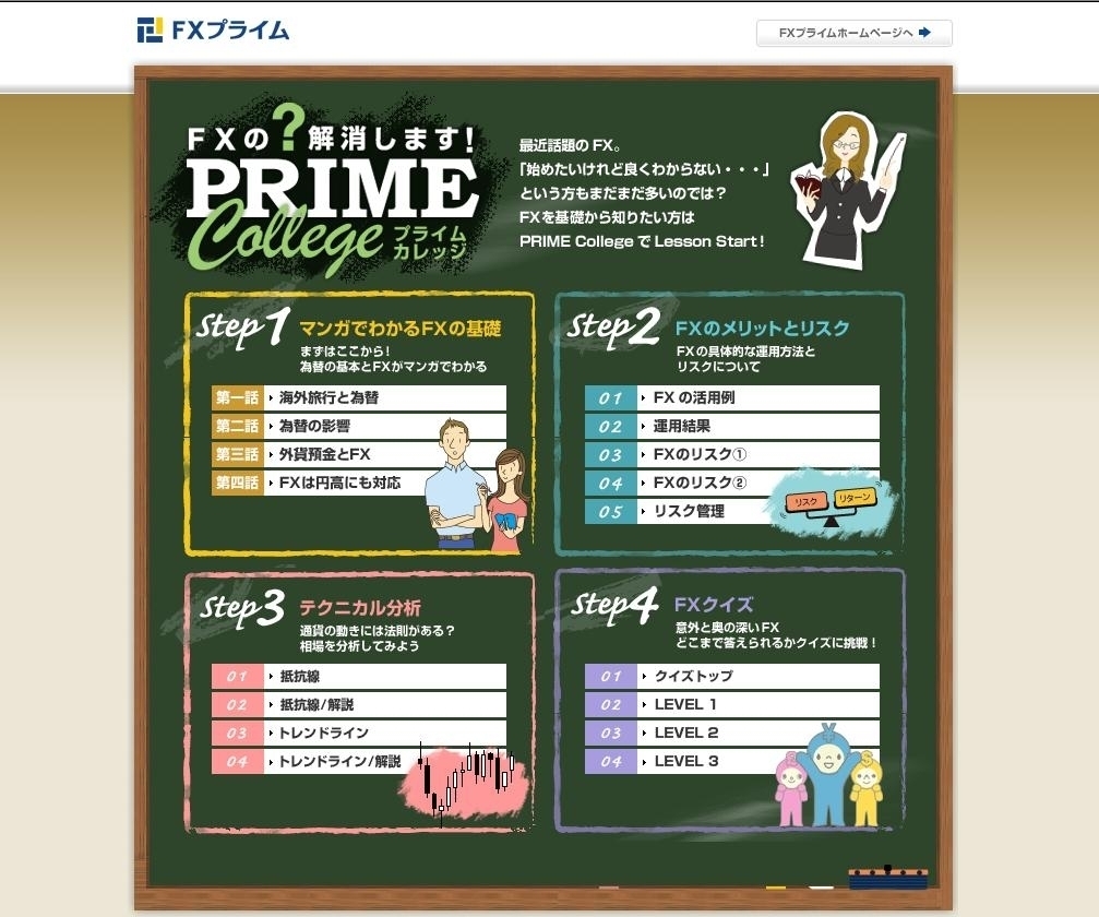 PRIME collegeトップページFXプライムは、T会員に対してFXの基礎からテクニカル分析、リスクまで幅広く学ぶことができるコンテンツ「PRIME college( http://www.fxprime.com/college/ )」を紹介し、FXを正しく理解していただいた後、口座開設および取引をされたお客様にTSUTAYAやファミリーマートなど53社29,000店舗でご利用いただける「Tポイント」を最高8,000ポイントプレゼントいたします。