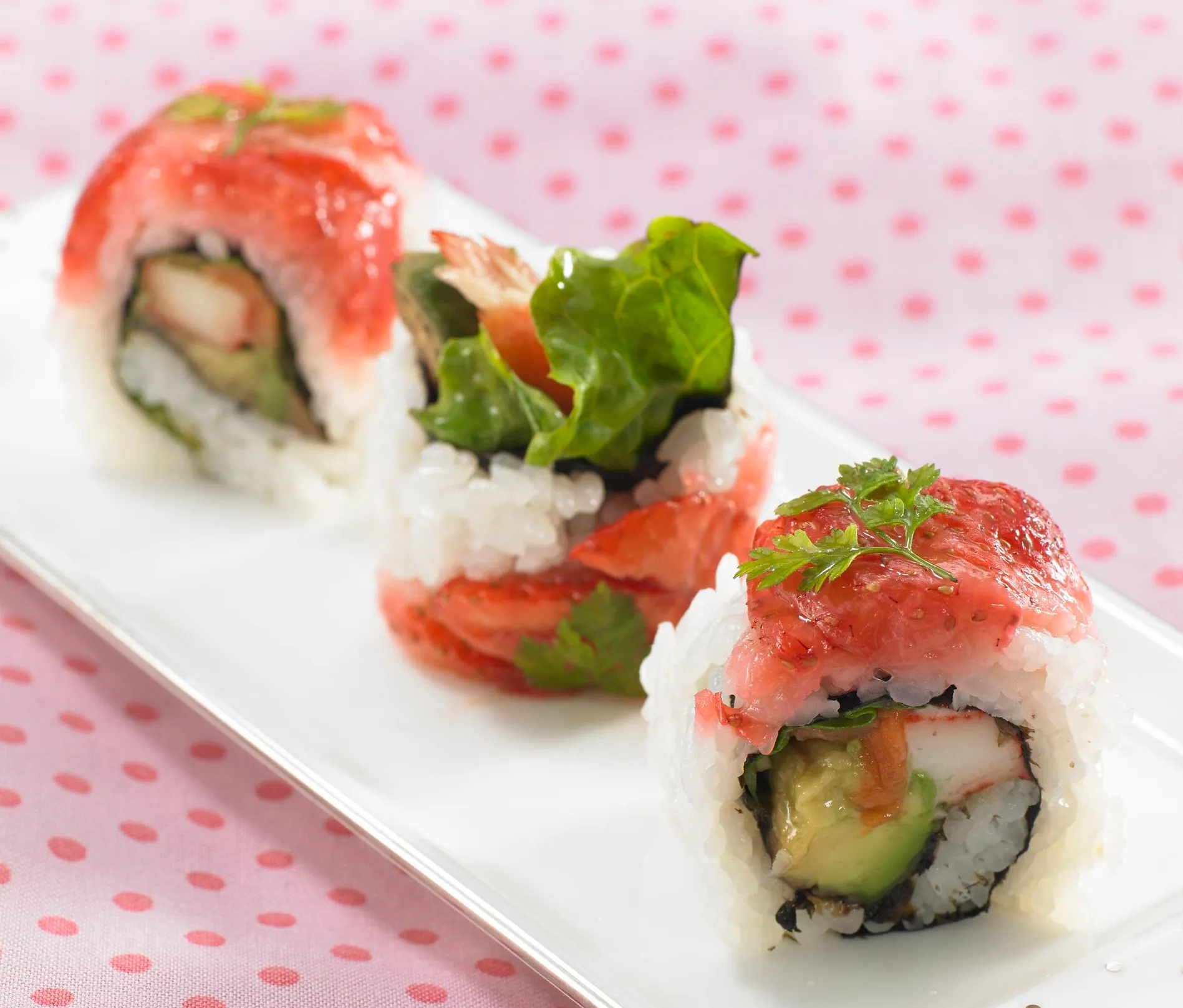 ロール寿司の上に、大玉で甘みと酸味のバランスが良いのが特長の「ゆうべに」をトッピング。バルサミコ酢とイチゴの相性が抜群の、おやつ感覚で楽しめるさわやかな一品です。