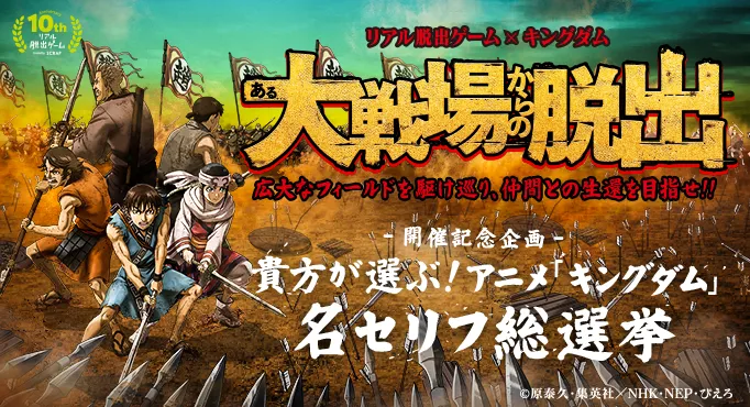 リアル脱出ゲームを手がける株式会社SCRAP(本社:東京都渋谷区 代表:加藤隆生)は、大人気アニメ作品『キングダム』(原作:原泰久/集英社発行「週刊ヤングジャンプ」連載中)とコラボレーションしたリアル脱出ゲーム、「ある大戦場からの脱出」の開催記念企画として、2017年2月10日(金)18時より『貴方が選ぶ!アニメ「キングダム」名セリフ総選挙!』を実施します。本件は、アニメ「キングダム」の名セリフ(各キャラクター5つの候補セリフ)を、一般の方にtwitterを使って選んでいただくという趣旨の企画です。さらに、一番投票数が多かった各キャラクターの名セリフが、リアル脱出ゲームではおなじみのグッズ「クリップボード」にデザインされます。また、投票していただいた方の中から抽選で計15名様に、名セリフがデザインされたクリップボードをプレゼントします。