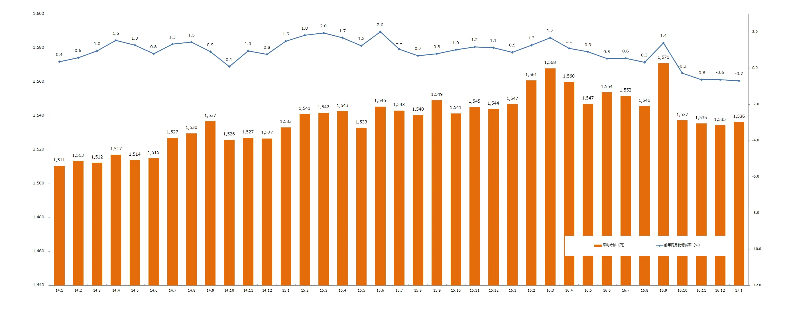 2017年1月度の派遣平均時給は1,536円。 「オフィスワーク系」の時給は、12ヶ月連続で1,500円台越え。