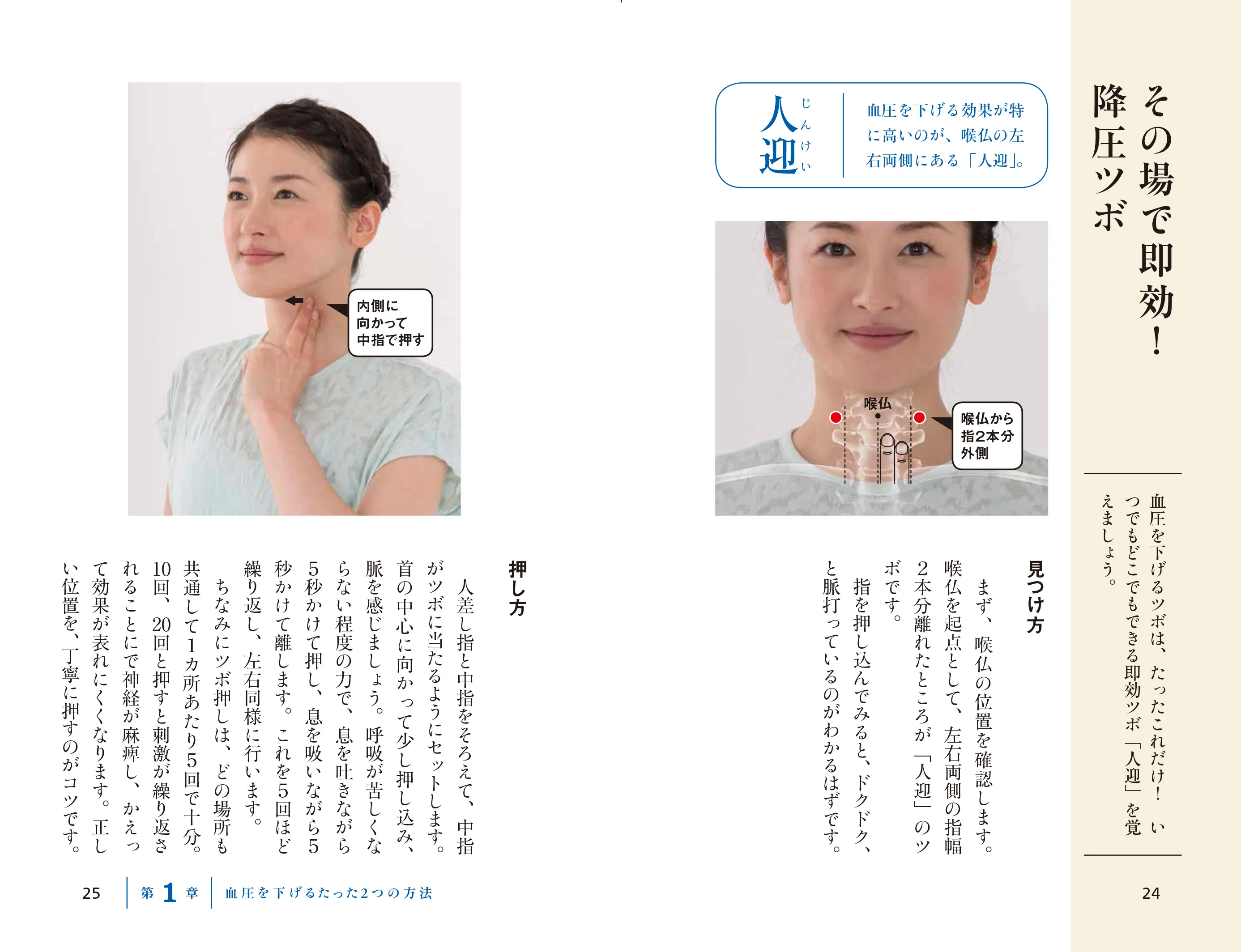 高血圧の人におすすめするメソッド「降圧ツボ」と「降圧ストレッチ」を写真とビジュアル満載で30ページ以上にわたり、分かりやすく紹介します。