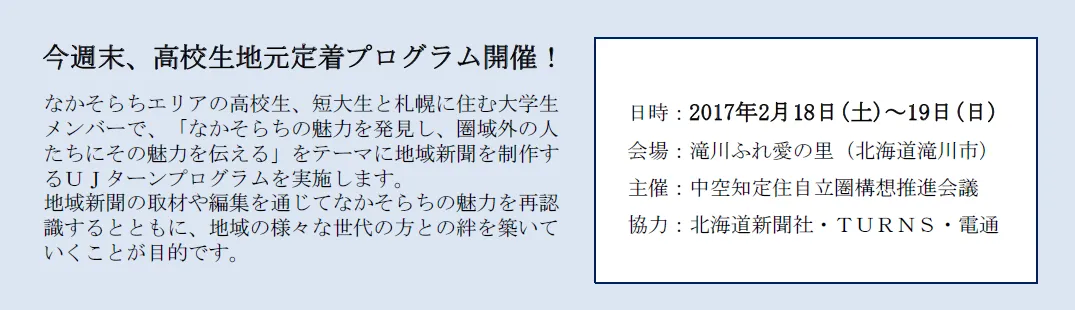 なかそらちエリアの高校生、短大生と札幌に住む大学生メンバーで、「なかそらちの魅力を発見し、圏域外の人たちにその魅力を伝える」をテーマに地域新聞を制作するUJターンプログラムを実施します。
