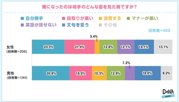 恋人と海外旅行に行って、相手を嫌いになったことが「ある」と答えた人に対し、「嫌になったのは相手のどんな面を見た時ですか?」と聞いたところ、男女共に1位は「自分勝手」(女性:23.3%、男性:26.8%)となりました。第2位は女性が「段取りが悪い」(21.4%)だったのに対し、男性は「文句を言う」(18.6%)と異なる結果となりました。男女で相手に求めるものが異なるようです。