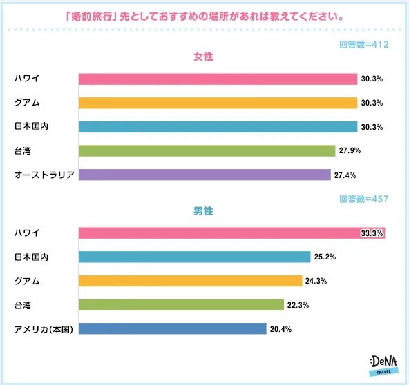 男性は2位以降を大きく引き離し「ハワイ」(33.3%)がトップとなりました。一方で、女性は「ハワイ」「グアム」「日本国内」が同率(30.3%)で1位となりました。全体的に暖かくて治安の良いエリアが人気のようです。