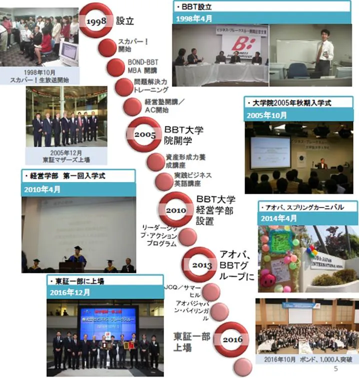 BBTは、国際舞台で渡り合うことのできる日本人リーダーを育成したいという強い思いにより、1998年に誕生しました。以来、経営、問題解決、ビジネス英語など、グローバルリーダーに必要な要素を獲得するための講座を次々と提供。2013年にはアオバジャパン・インターナショナルスクールをグループに迎え、1歳~経営者まで、全ての年代に適した教育を提供するプラットフォームを形成し、さらなる飛躍に向けて邁進しています。