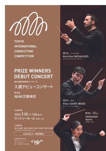 東京国際指揮者コンクール2024(主催:一般財団法人民主音楽協会)において入賞を果たした3名の若き指揮者と、日本を代表するオーケストラ・NHK交響楽団が共演する「入賞デビューコンサート」を、2025年7月10日(木)に東京・サントリーホールで開催いたします。