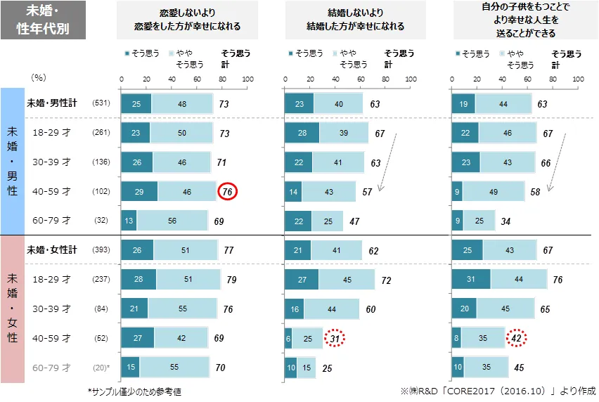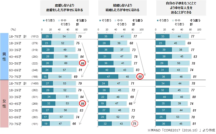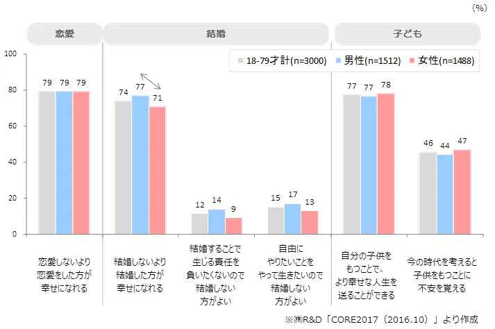 “男女ともに7割以上が「恋愛・結婚をしたほうが幸せ」「子供をもつことでより幸せ」と回答”