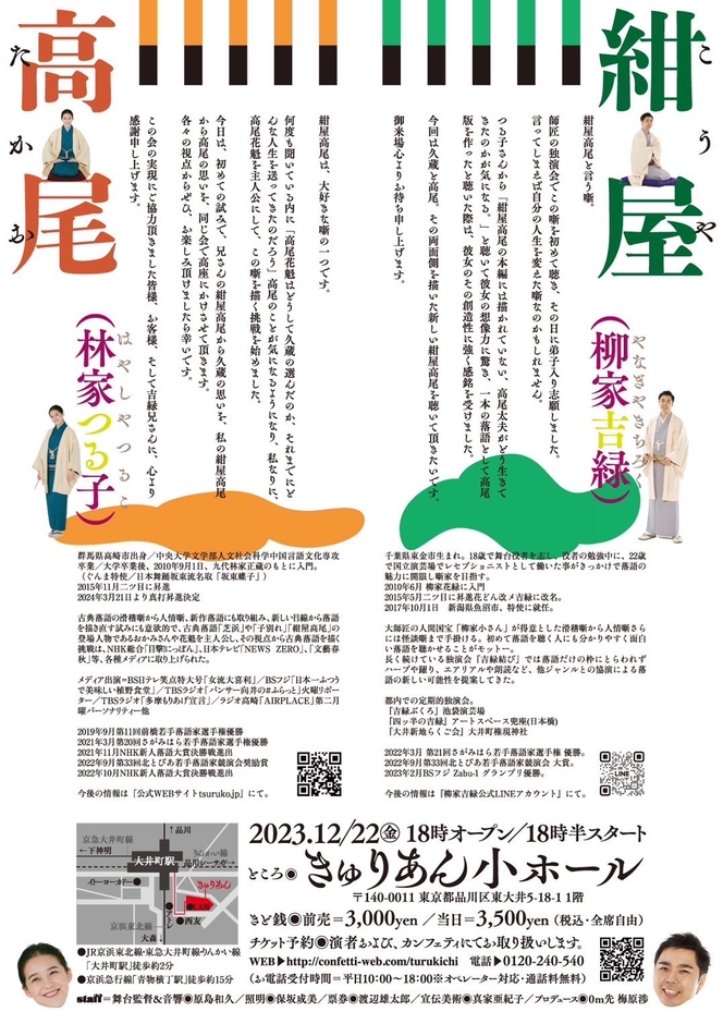 柳家吉緑 林家つる子 二人会『紺屋高尾』が2023年12月22日 (金)にきゅりあん小ホール(東京都品川区東大井5-18-1)にて開催されます。チケットはカンフェティ(運営:ロングランプランニング株式会社、東京都新宿区、代表取締役:榑松 大剛)にて発売中です。
