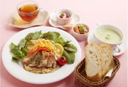 やまみつとハーブでマリネした鶏モモ肉をオーブンでこんがりローストしました。爽やかなレモンとコクのある アンチョビバターでお召し上がりください。彩り野菜と数種のリーフで春らしいメイン料理はもちろん、前菜、スープ、デザートそれぞれに春を満喫いただけるコースです。