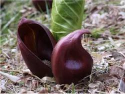 北海道・本州の湿地に生える高さ20cmほどの多年草です。雪が溶けると間もなく、濃い茶色の仏炎苞がむっくりと顔を出します。その姿が、ダルマ大師が座禅を組んでいるようにみえるため、「ザゼンソウ」と和名が付けられ、別名「ダルマソウ」とも呼ばれます。ミズバショウと同じ仲間で、葉は花が終わるころに伸びてきます。なかなか見ることのない紅色の仏炎苞に驚く方は多く、早春の季節に人気を集めています。