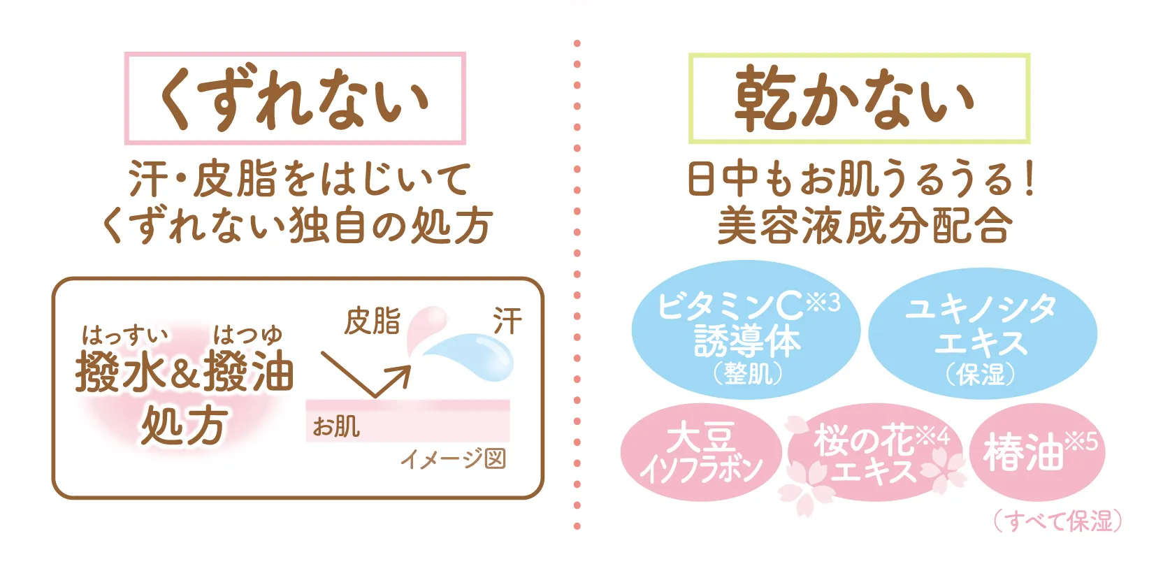 汗・皮脂に強くくずれない独自の撥水(はっすい)&撥油(はつゆ)処方です。